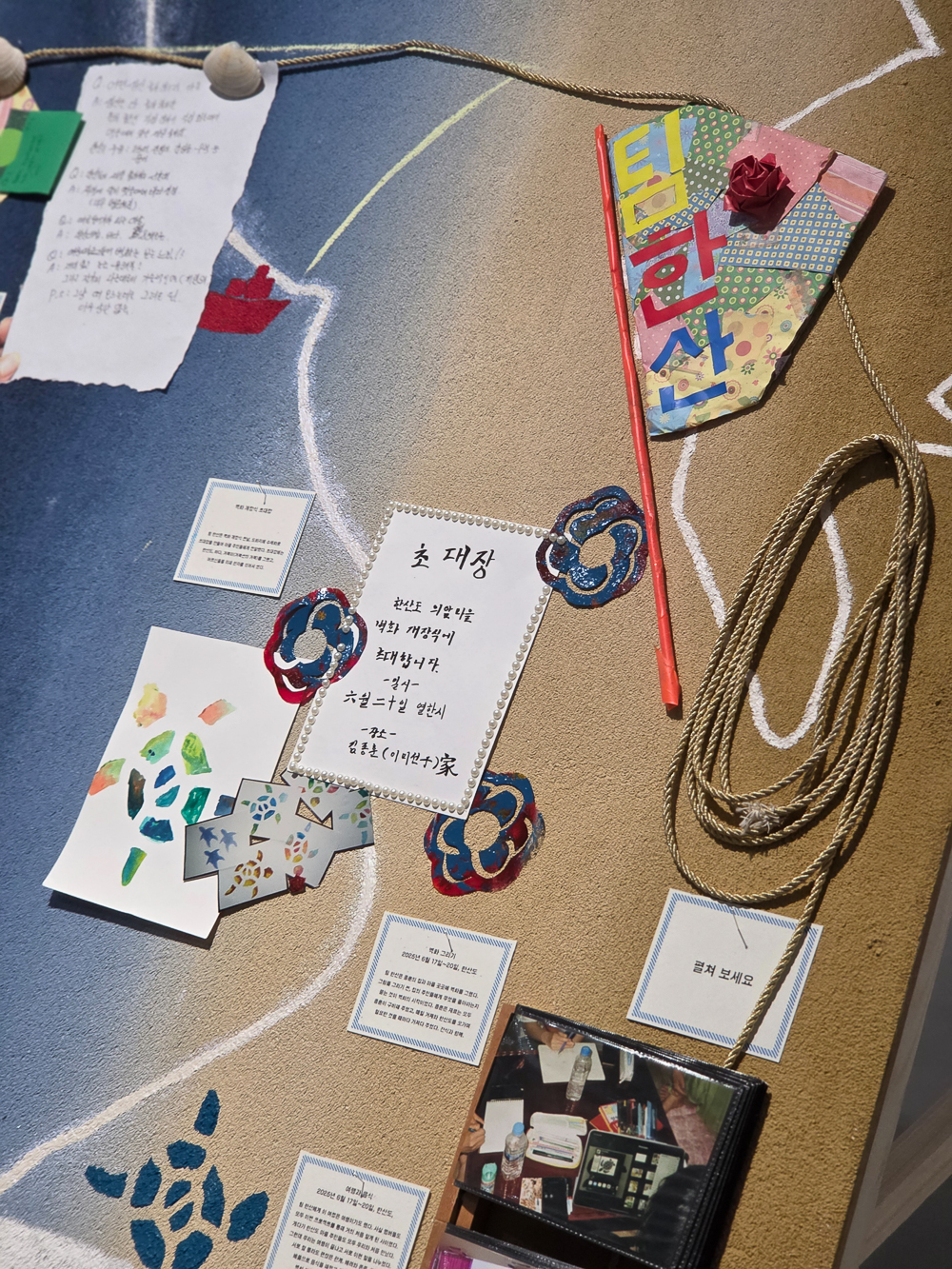 팀 한산의 〈진주실로 꿰어서 보배〉(2025)는 회화 작가 3인—양연희, 정하슬린, 조휘경과 관찰자 홍자영이 기획자의 아버지 집과 마을에 벽화를 그리며 배운 '우리가 되기'의 감각을 현장 설치로 번안한다. 올해 여름, 팀 한산은 한산도로 3박 4일의 여정을 떠났다. 시작은 약 15년 전, 자신이 사는 마을이 벽화로 꾸며지기를 소망한 기획자의 아버지 김종훈의 염원이었다. 도시에서 온 이들이 섬에 머무르는 동안 아버지와 마을 주민들은 직접 낚시를 해서 잡은 물고기, 반찬, 과일, 자동차, 휴식처 등을 제공하며 매일같이 작가들을 돌보고, 스스럼없이 환대해 주었다. 팀 한산은 이들과 나눈 온정 어린 이야기를 전시장에 풍경처럼 펼쳐 되새긴다. 작품은 수행된 벽화를 재현하는 일을 넘어, 그 시간과 관계 속에서 피어난 공명을 하나의 사건으로 제시한다.